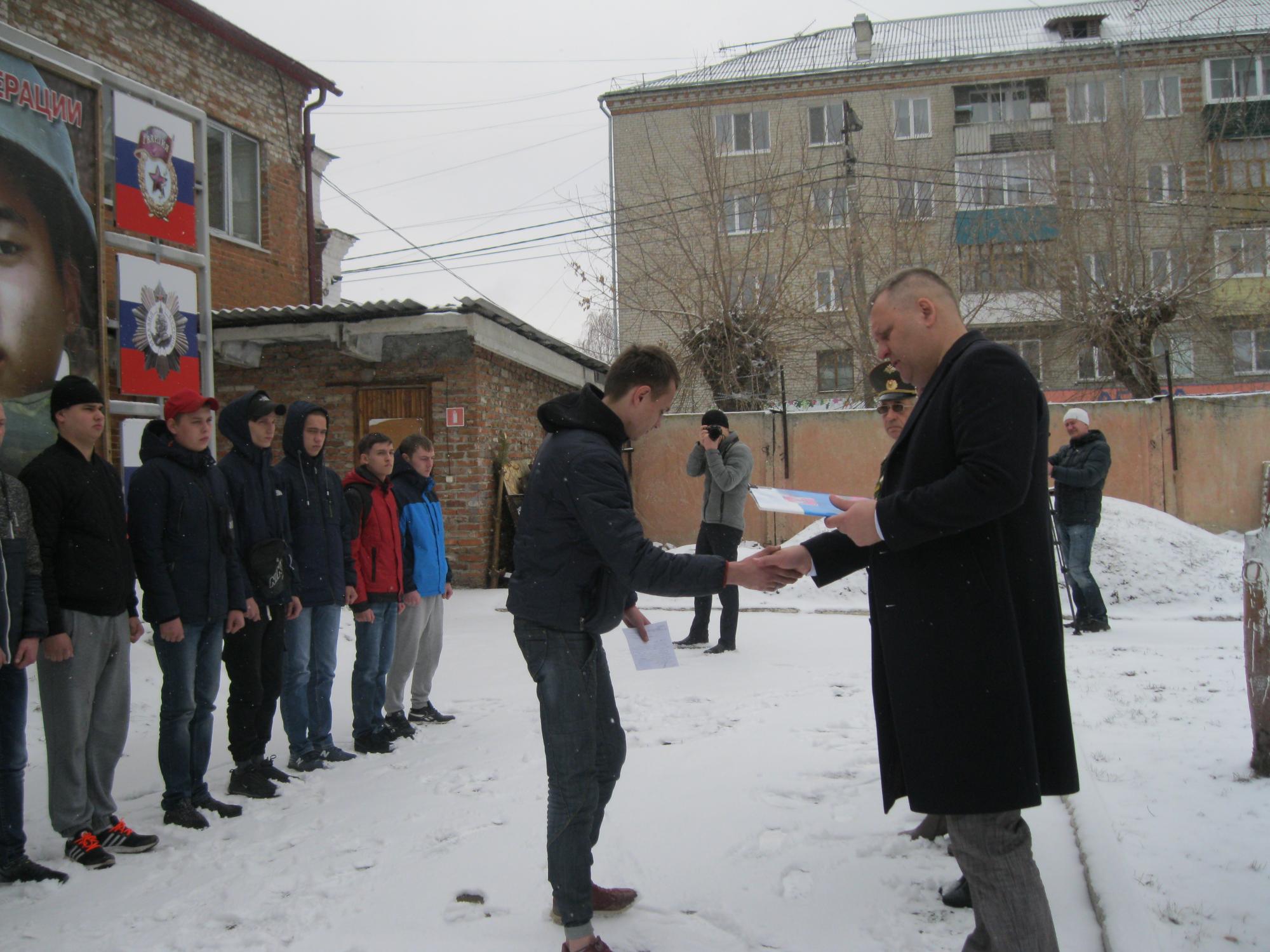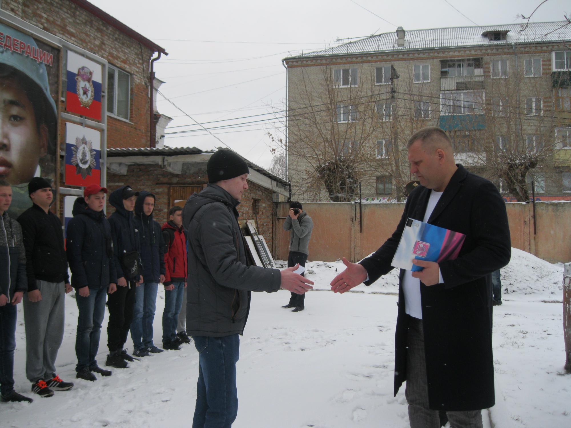 По сложившейся традиции, мероприятие началось с построения во дворе военкомата. Ребят поприветствовали начальник отделения призыва Шадринского военкомата В.В. Пальчик, помощник начальника В.Г. Кушнерёв, начальник управления образования Л.И. Воложанина.