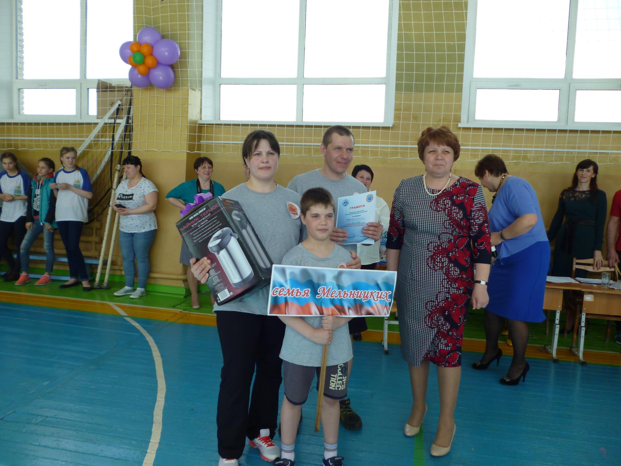 И вот самый волнующий момент — награждение призёров и победителей: на третьем месте семья Павла, Евгении Викторовны и Владимира Николаевича Мельницких (Краснозвездинская), на втором — Ксения, Ольга Сергеевна и Андрей Николаевич Антроповы (Красномыльская школа). А первое место и переходящий кубок в этом году завоевала семья Нины, Ирины Сергеевны и Дмитрия Сергеевича Кармановых. Победителям было предоставлено право опустить флаг соревнований.