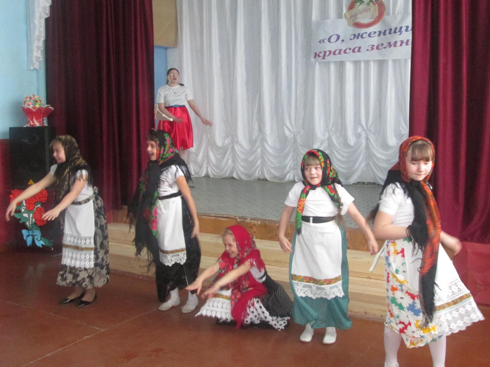 Праздник открыли дети танцем «Ангел». Красивые слова в честь женщин звучали от ведущих Дани Духанина, Даши Киселёвой и Димы Андреева. Впервые своим выступление в клубе порадовали дети детского сада «Колокольчик». Пап поздравили танцем; стихами и песнями поздравили мам, а бабушек порадовали танцем «Неваляшки». Танцевальные коллективы женщин порадовали своими новыми танцами. Песни прозвучали в исполнении вокального коллектива «Ладушки», И. Неклюдовой, К. Неклюдовой, М. Ерёминой, О. Меньшиковой и её внучки Вики, О. Киселёвой, И. Самариной, Л. Жуковой. Гостья из г. Кургана А. Федорцова показала танец «Фаина» и «Гимнастический этюд».