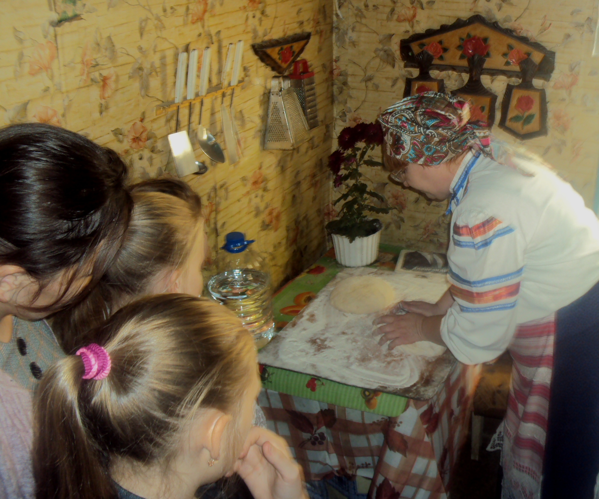 В печке пёкся хлеб, а хозяйка позвала всех к столу. За чашкой чая речь шла о русской старине, о том, как жили наши предки. Ребята узнали, что русская печь существует не одно тысячелетие. Она универсальна – и дом нагреет, и пищу приготовит, и обувь просушит, и хлеб испечёт для всей семьи. Ребята отгадывали загадки о «деревенской кормилице», объясняли значение поговорок, связанных с русской печью, например: «Лежебока хочет есть, да не хочет с печи слезть» или «Сиди на печи да гложи кирпичи». Все они сводятся к тому, что прежде надо потрудиться, а лёжа на печи ничего не добьёшься.