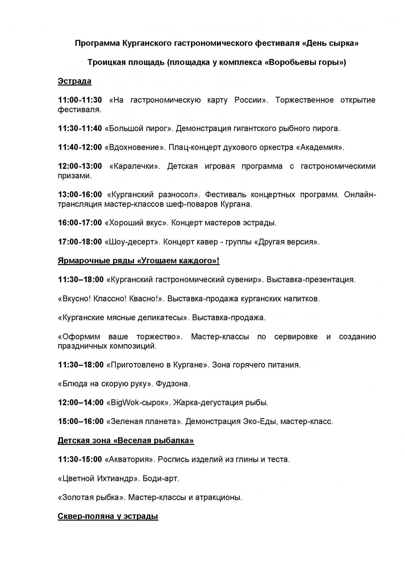 Начнётся праздник в 10.00 открытием V регионального конкурса «Зауралье мастеровое». В 11.00 стартует гастрономический фестиваль «День сырка», который станет ярким сюрпризом для взрослых и детей. В течение дня на Троицкой площади будут работать ярмарочные ряды. Самым зрелищным и фееричным событием обещают стать мастер-классы от шеф-поваров курганских ресторанов, во время которых все желающие смогут оценить блюда с неожиданными и оригинальными сочетаниями ингредиентов и вкусов. Ещё одним сюрпризом станет жарка-дегустация рыбы «BigWok-сырок».