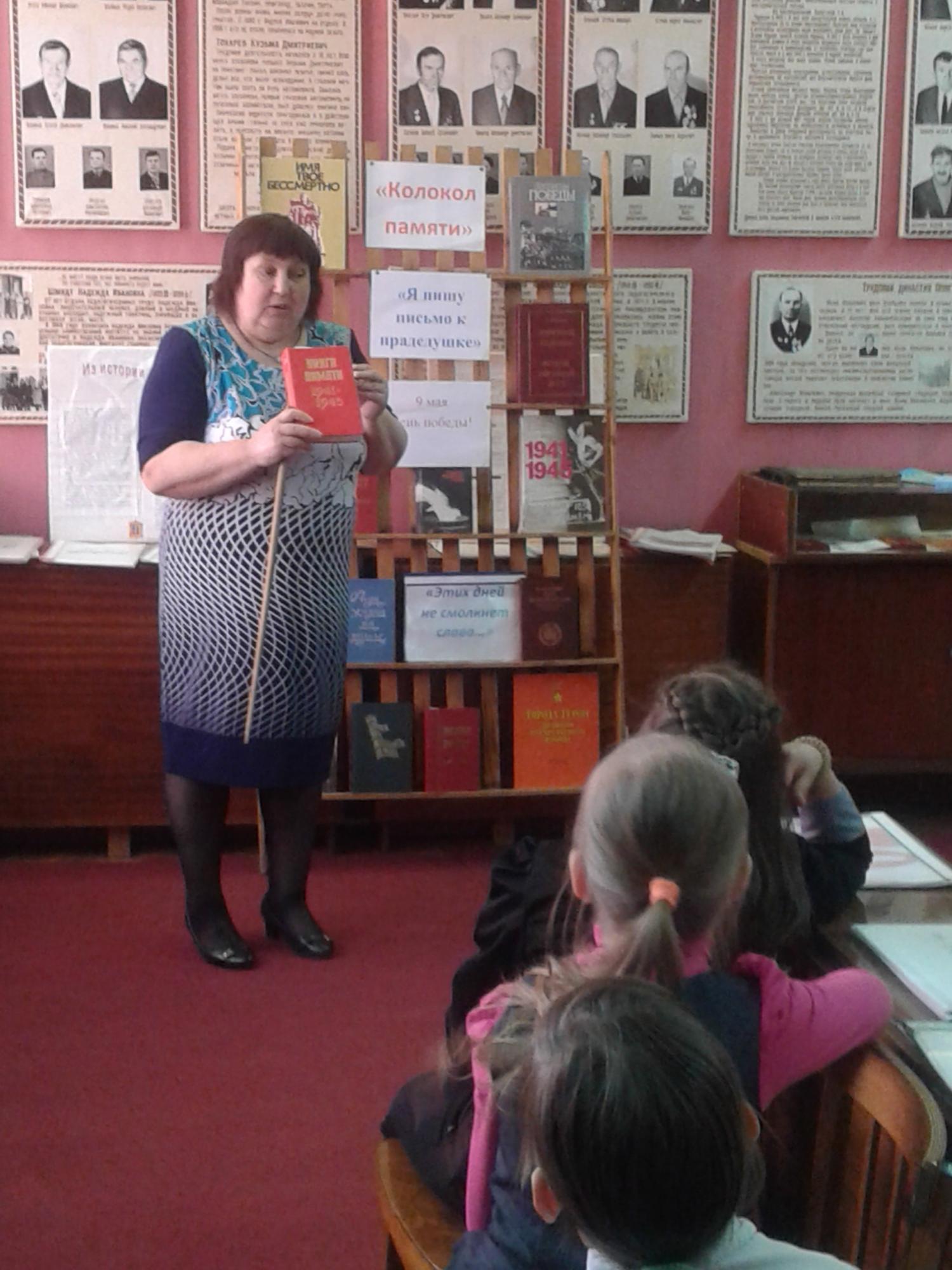 Ученики 3 класса посетили школьный музей, где С.А. Боярчикова рассказала о суровых военных годах, которые выпали на долю нашего народа, о борьбе с фашизмом, о потерях, которые понесла наша страна во время войны. Она также познакомила ребят с серией Книг памяти, вышедших в Шадринском районе. В них дети нашли информацию о своих родных и близких, которые воевали на фронте и трудились в тылу.