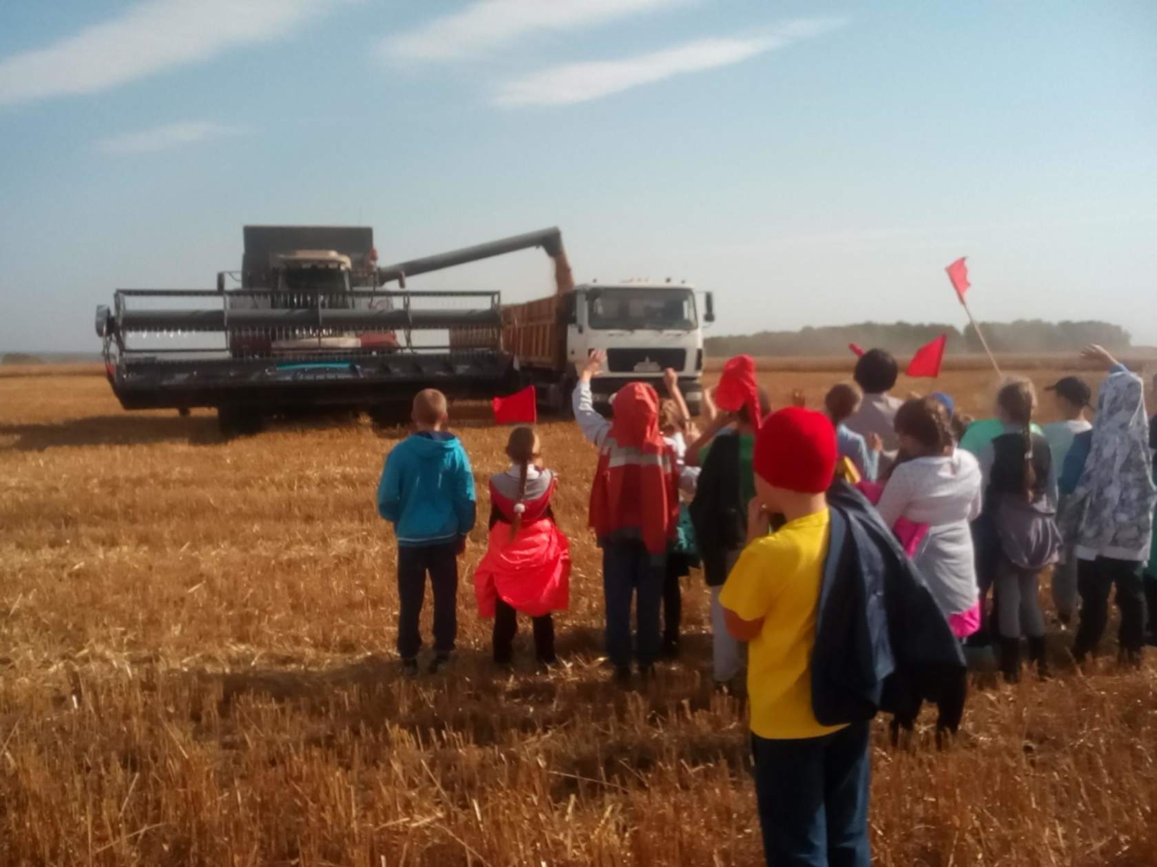 Радости ребятишек не было предела, когда зерно из шнека комбайна густым золотистым потоком полилось в кузов грузовой машины. Пришедшие на поле мальчишки и девчонки хоть и сельские, но за таким действом наблюдали впервые, а потому то и дело восторженно о чём-то переговаривались и махали алыми флажками. Да и работающие в тот день на уборке урожая хлеборобы ООО «Рассвет» юных гостей встретили радушно и, позволив своим стальным коням минутный перерыв, сфотографировались с ребятами на память.
