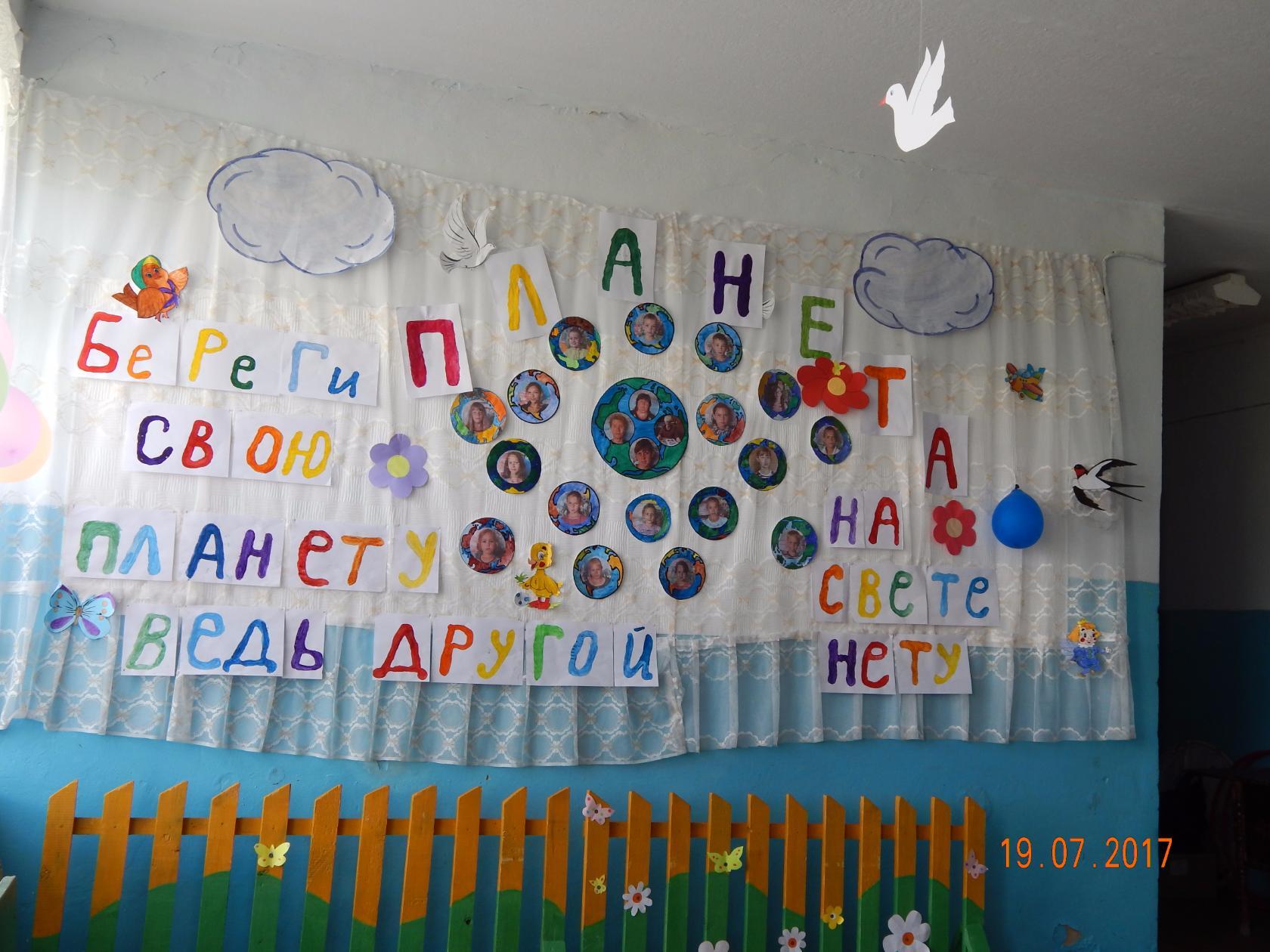 В первый день на площадке мы оформили отрядный уголок «Планета»: у каждого ребёнка была своя планета, собственноручно раскрашенная, с фотографией в центре.