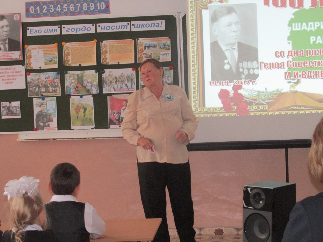 В прошлом году имя героя Важенина было присвоено нашей Батуринской школе. К юбилейной дате был запланирован цикл социально значимых мероприятий. Волонтёры навестили могилу героя-земляка, навели порядок и возложили цветы. Во всех классах прошли единые уроки мужества «Знаем! Помним! Гордимся!» Особую атмосферу дня создавали песни военных лет, которые звучали на школьных переменах. Волонтёры раздавали эмблемы «Сто лет герою». Самые активные ребята участвовали в общешкольной викторине «По страницам истории Великой Отечественной войны». Все желающие с интересом посетили экспозицию, посвящённую жизнедеятельности