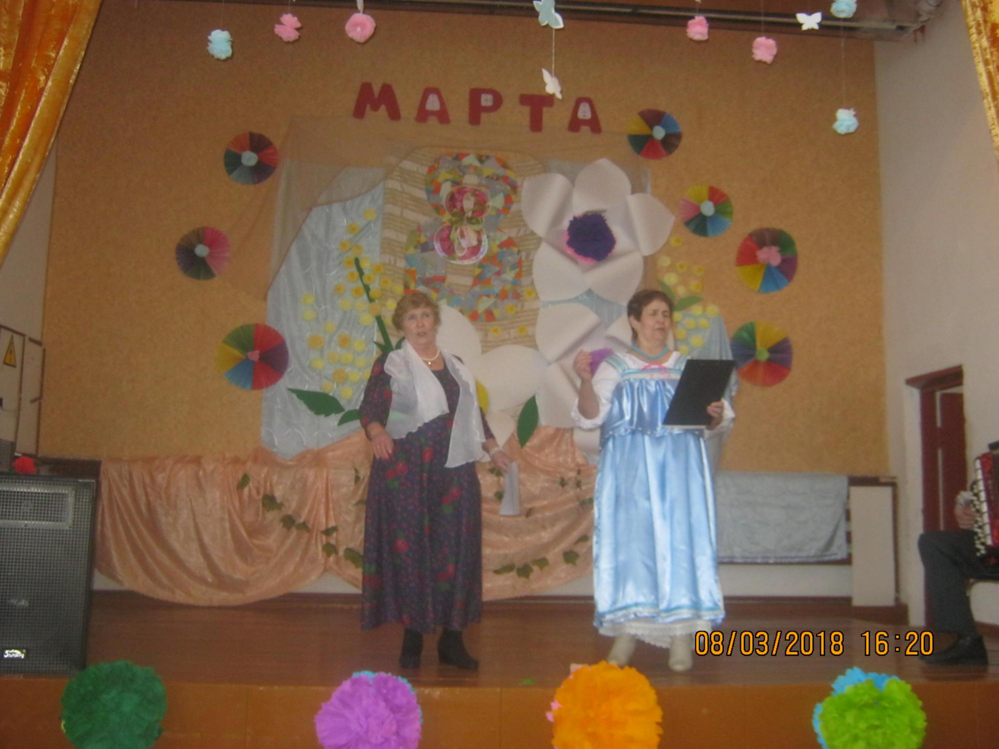 Праздник открыли дети танцем «Ангел». Красивые слова в честь женщин звучали от ведущих Дани Духанина, Даши Киселёвой и Димы Андреева. Впервые своим выступление в клубе порадовали дети детского сада «Колокольчик». Пап поздравили танцем; стихами и песнями поздравили мам, а бабушек порадовали танцем «Неваляшки». Танцевальные коллективы женщин порадовали своими новыми танцами. Песни прозвучали в исполнении вокального коллектива «Ладушки», И. Неклюдовой, К. Неклюдовой, М. Ерёминой, О. Меньшиковой и её внучки Вики, О. Киселёвой, И. Самариной, Л. Жуковой. Гостья из г. Кургана А. Федорцова показала танец «Фаина» и «Гимнастический этюд».
