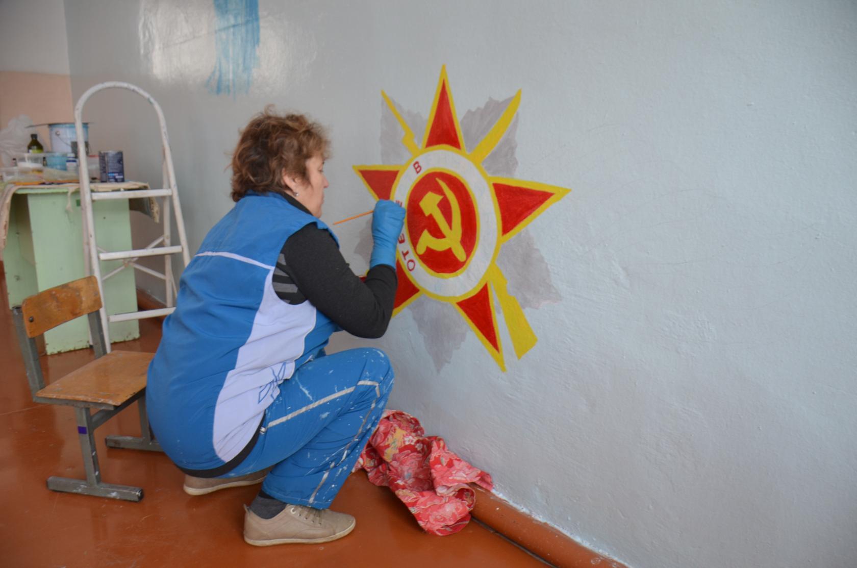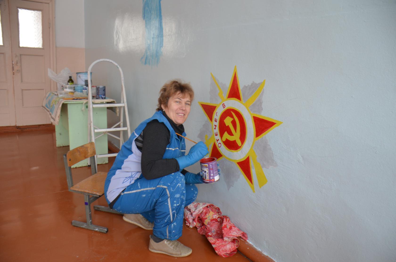 Немало нужно выполнить и чисто технической работы. Потому мужчины и мальчики во главе с директором Д.Н. Сухоруковым мастерят стенды и витрины. Технические работники убрали со стены старое покрытие и покрасили её заново, а учитель ИЗО и географии