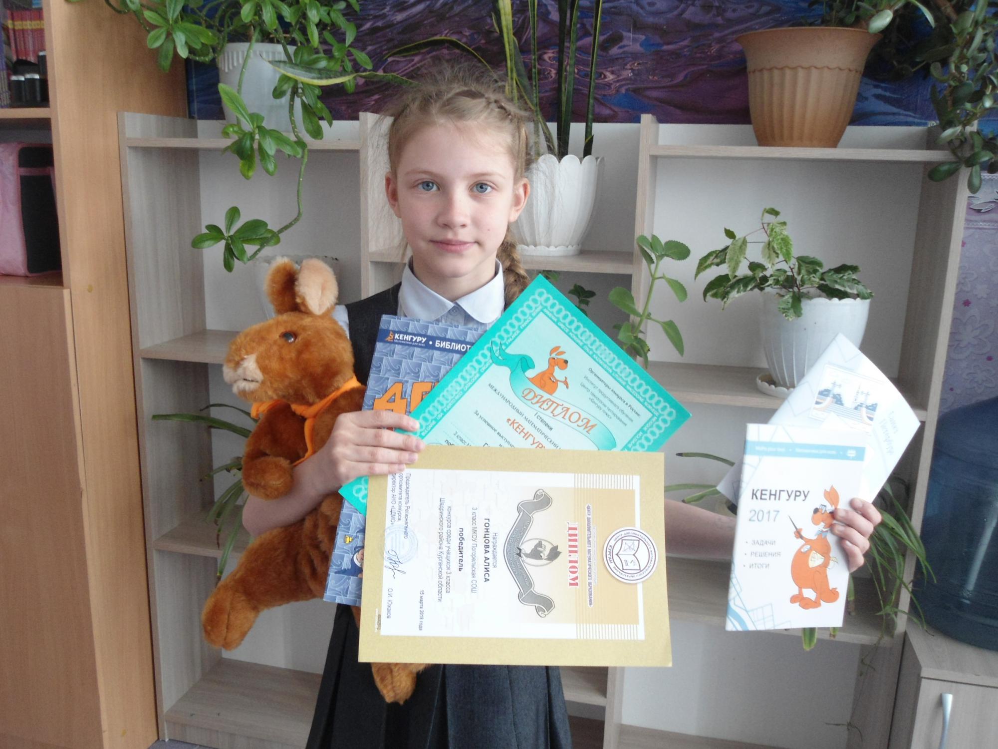 21 мая на общешкольной линейке были вручены дипломы и грамоты лучшим математикам школы – участникам конкурса «Кенгуру – математика для всех» (всего участвовал 51 ученик со 2 по 8 класс). Дипломы и грамоты за успешное выступление в конкурсе «Кенгуру» получили Анна Якова и Ульяна Гаврилова (3а класс), Константин Букрин (4а класс). Успешно выступили и учащиеся 2а класса – Егор Чудов получил похвальный отзыв за успешный дебют в конкурсе, остальные – буклеты «Памятный подарок второкласснику». Дипломы победителей вручены Анастасии Черновой (8 класс), Тимуру Сергееву (3а класс), а Алиса Гонцова получила главный приз конкурса – диплом победителя и плюшевого кенгурёнка!