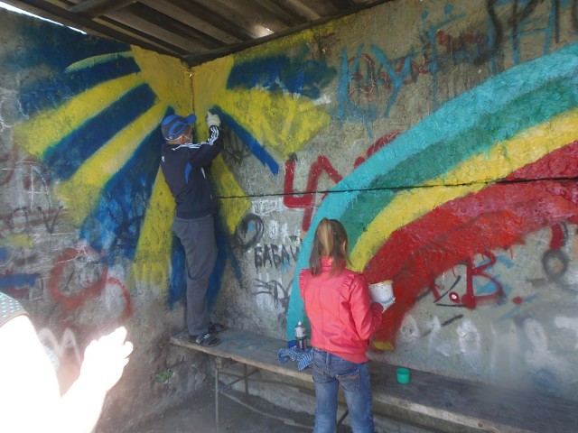 1 июня деревенские ребятишки, вооружившись кисточками, простой и в баллончиках краской, отправились к местной автобусной остановке, чтобы привести её в порядок. Сооружение это далеко не новое, но сельчанам всё же захотелось его разукрасить, чтобы оно стало ярким и опрятным. Средства на приобретение необходимых материалов собрали взрослые, а за воплощение задумки в жизнь взялась детвора.
