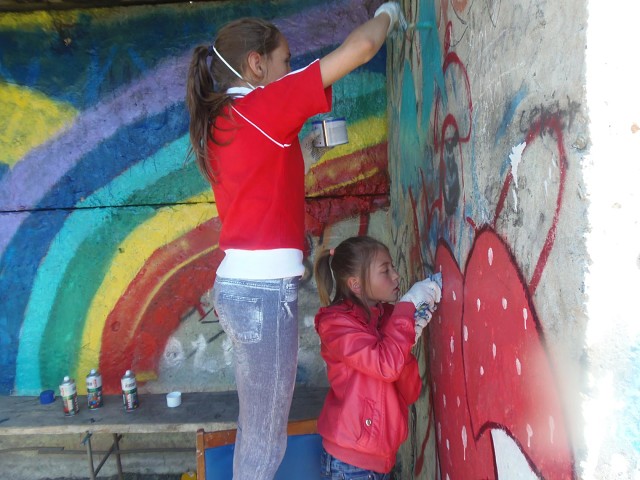 Примерно за четыре часа на стенах остановки засияло солнышко и засверкала яркими цветами радуга, распустились цветы и поспели фрукты и ягоды, вышла на прогулку лошадка и появились герои любимых мультфильмов. И всё это благодаря труду С. Устиновой, В. Шамарова, Е. Криворотовой, А. Устиновой, В. Быковой, Н. Тюшняковой, Е. Рыцева, А. Быкова, А. Назаровой, С. Чудиновой, а также М.В. Тюшняковой и Н.В. Быковой.