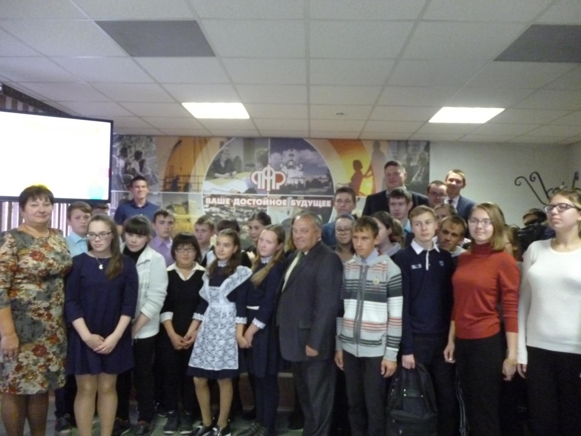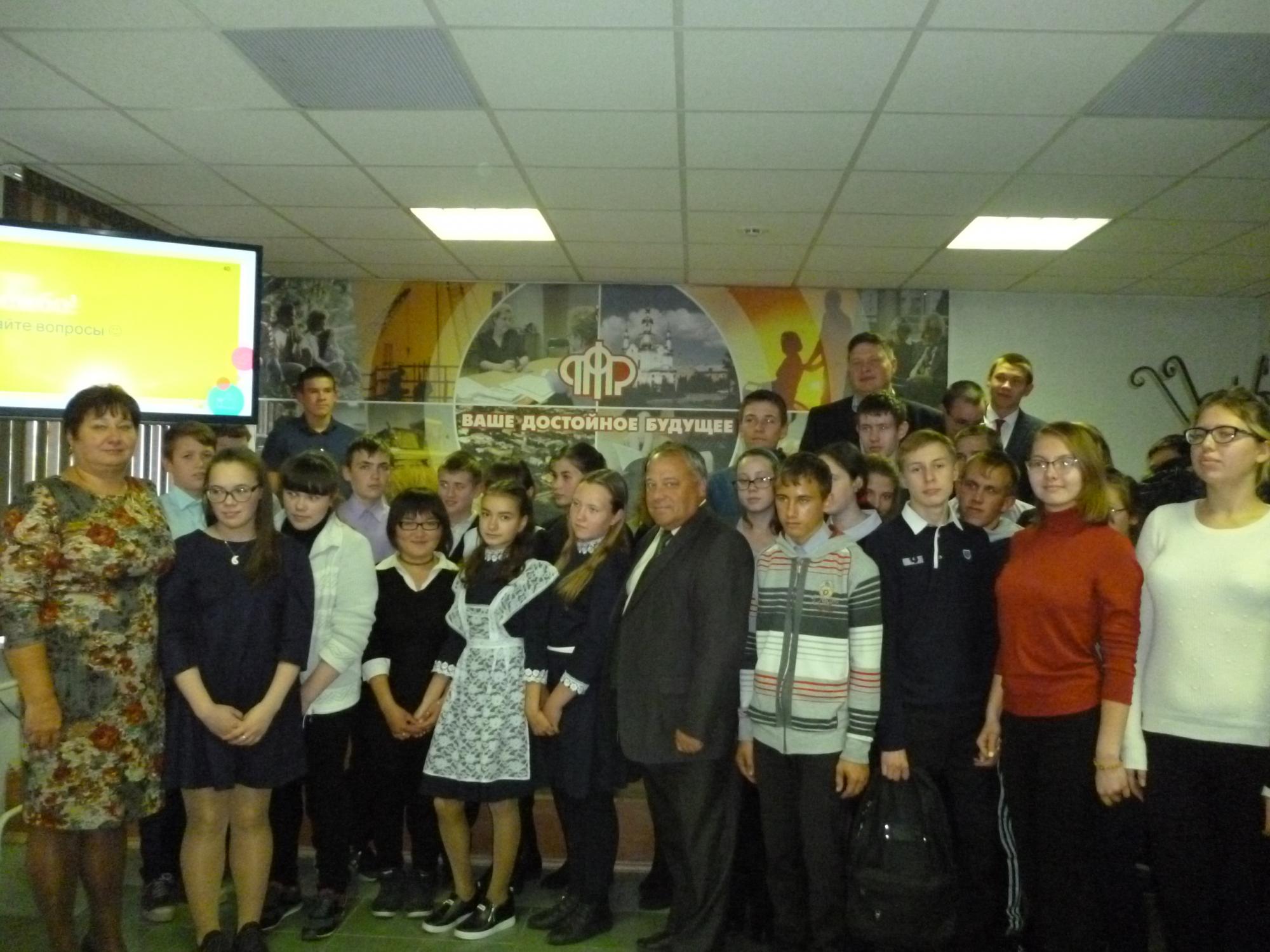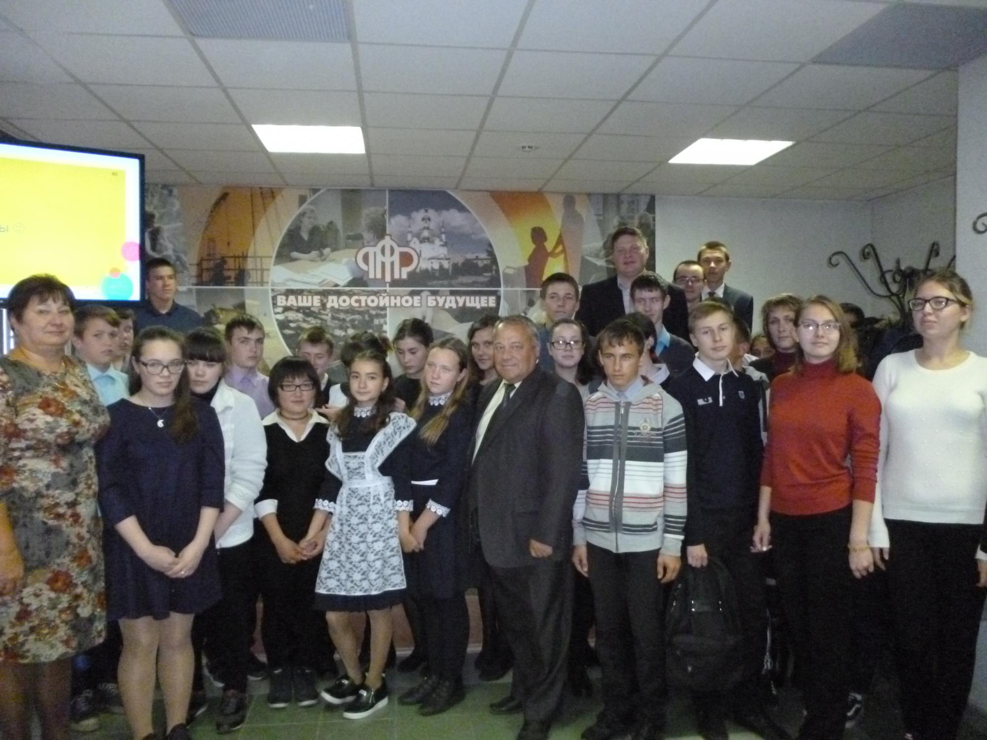Начальник Управления С.Т. Тигиняну рассказал ребятам об основных направлениях деятельности Пенсионного фонда, объяснил, зачем нужен СНИЛС. Заместитель начальника Управления О.В. Пестерев провёл с ребятами урок пенсионной грамотности, на котором в доступной форме в виде красочных слайдов на интерактивной доске было рассказано об истории пенсионного обеспечения в России, от чего зависит размер назначаемой пенсии и почему так важно получать «белую» зарплату. Старшеклассники также узнали, что большинство государственных услуг Пенсионного фонда можно получить не выходя из дома. Все услуги и сервисы, предоставляемые ПФР в электронном виде, объединены в единый портал на сайте Пенсионного фонда — pfrf.ru.