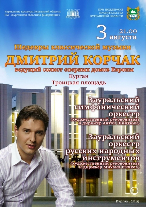 3 августа впервые в истории Курганской области на Троицкой площади в Кургане под открытым небом даст концерт оперный певец с мировым именем Дмитрий Корчак. Он выступит вместе с Зауральским симфоническим оркестром и Зауральским оркестром русских народных инструментов.